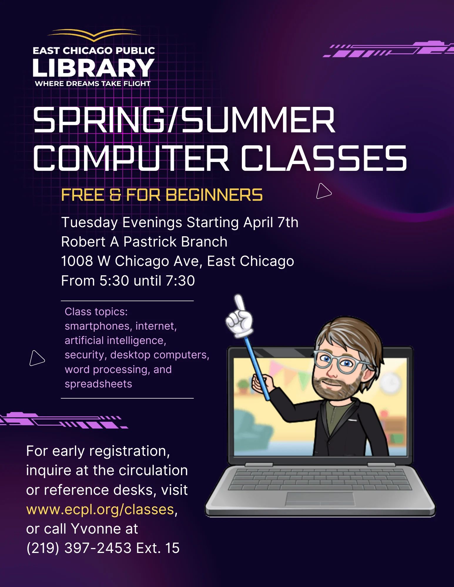 Computer classes in the spring/summer are every Tuesday evening from 5:30 to 7:30 for 12 weeks at our Pastrick branch on Chicago Ave. starting on April 7th. If you are interested in these classes you may sign up by filling out this form.