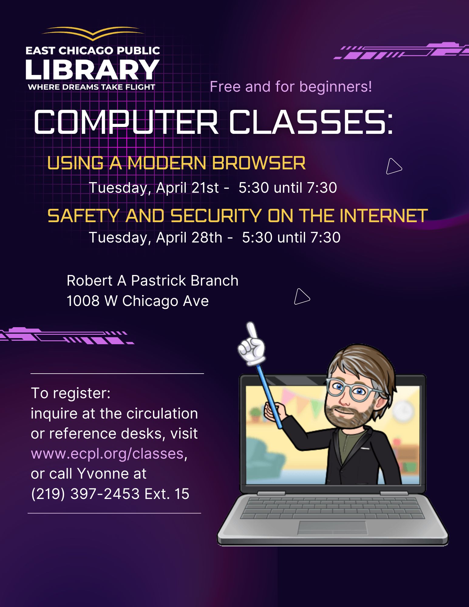 Computer classes are taught twice a year.Every spring at our Robert A Pastrick Branch, and in the fall at our Main Library.